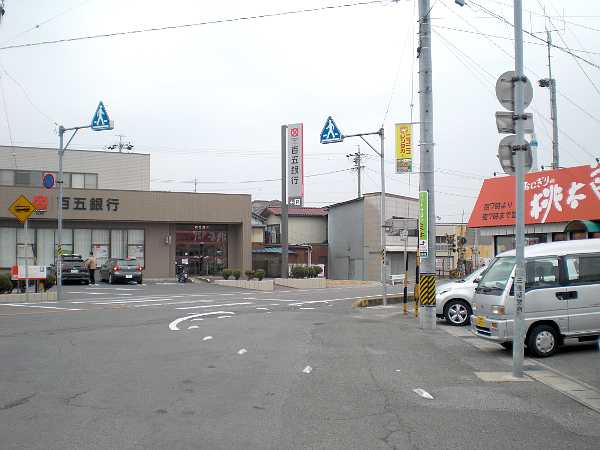近鉄内部線追分駅のすぐ傍、百五銀行前で、先ほど渡った旧国道に合流する(左・左写真=14:29)。