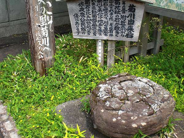 むかし付近の川から写真のような菊花紋の石がたくさん出土し川やこの土地の名前になったとある。