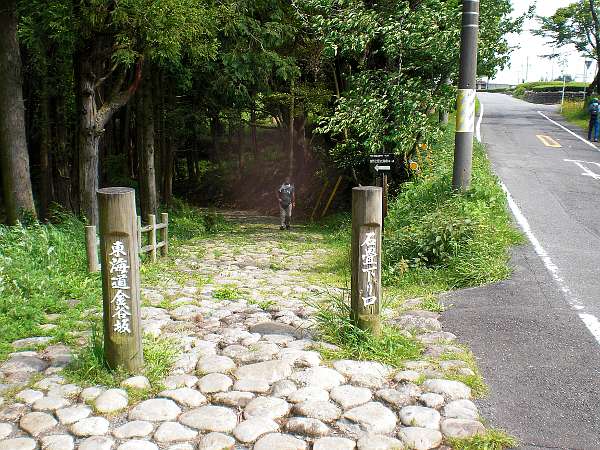 遙かに見下ろしていた国道一号線を見上げるほどに下りた辺り,アスファルト道の丁字路のすぐ手前に石畳の旧道がある(右・左写真=12:53)。