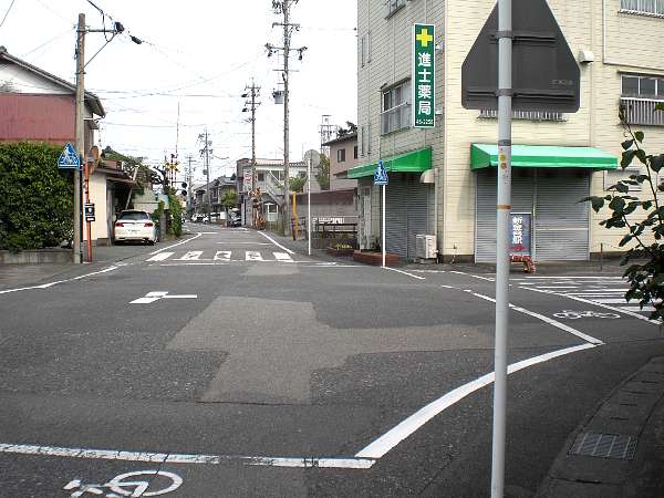 さらに,二筋目(交差点内茶色の舗装)「シミズ写真館」の角を