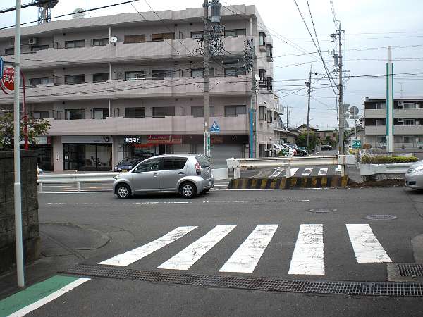 坂を下ってすぐ横を走る県道へ移る(右・左写真=10:07)。次の信号辺りで県道の左側へ渡っておいた方が良い。