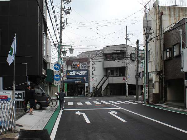 直進して清水駅前通の交差点[大手町](下・左写真)まで行ってしまったのだが,実はこの変則五叉路を右折するのが旧東海道であった。
