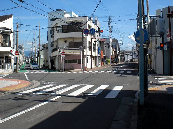市街地をくねくねとしながら進んで行くと,少し広い通りに交わる(左・右写真=17:23)。JR東海道線「富士駅」に通じる駅前通りである。