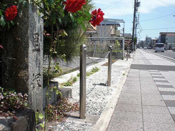 東名高速をくぐり,JR蒲原駅最寄りを過ぎ,さらに2キロ近く県道が緩やかに左カーブを描く辺りに,小さな松の木と灯籠,[