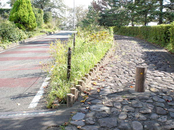 このように石畳風の歩道と、車道を離れた所は石畳と言うように、車道の蛇行をバイパスするように頂点を結び、所々歩道も一緒に蛇行する。