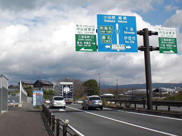 松並木を過ぎて少し行くと伊豆縦貫道の上を渡り、国道1号線[三島塚原IC]交叉に来る。(右・右写真=10:57)
