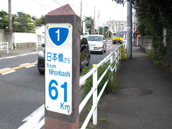 日本橋まで後61キロのポスト。(右・左写真=12:11) この先で「新湘南バイパス」の高架をくぐり、「小出川」を渡り、さらに大きく右にカーブしながら南に進む。