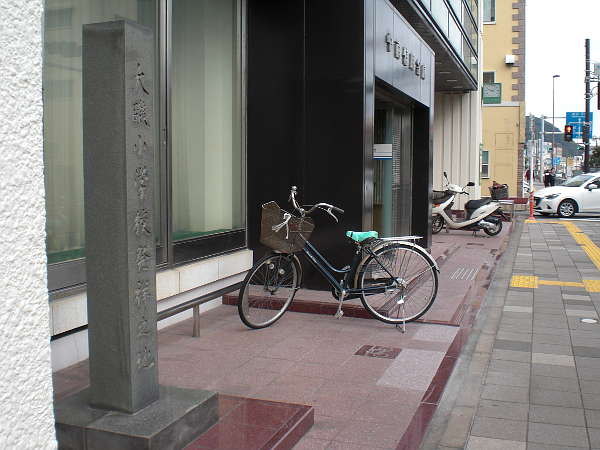 間もなく、国道右手に消防署(「大磯町消防本部」)が見えてくる。ちょうどその筋向かい、銀行の前に黒っぽい石碑が有り「大磯中学校発祥の地」と彫られている。