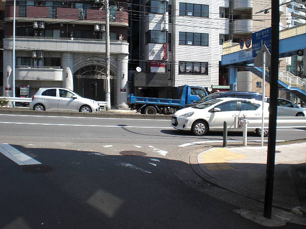 いくつか信号のある交差点を過ぎると、環状1号の上を首都高速が通っている(左・左写真=11:11)。