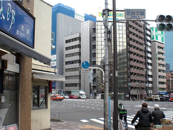 [芝四丁目]交差点(左・右写真=11:34)。 左斜めに進む(北へ折れる)