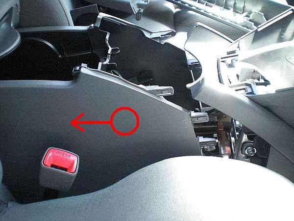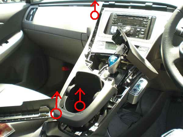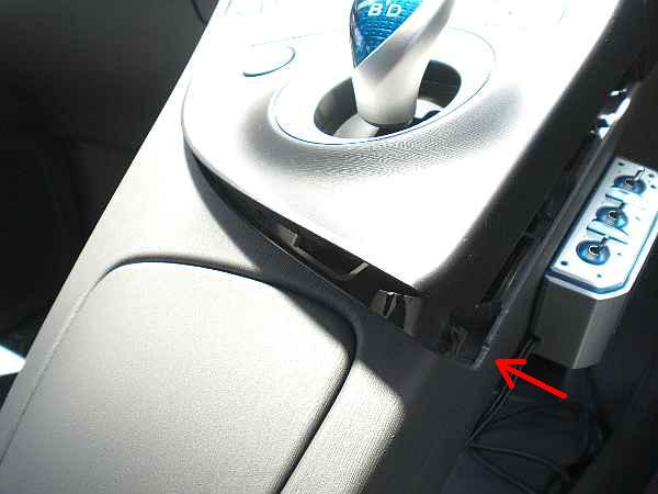 内部に配線するためセンターコンソールを分解するのだが、とっかかりはシフトノブ周りからである。赤矢印の所をドライバーなどに布を巻いてこじ開ける。