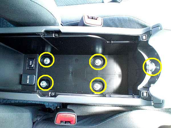 - コンソールボックスカーペットを取り除くと4本のボルトが見える。先ほどのパネルアッパー部のボルトと合わせて5本を取り外す。