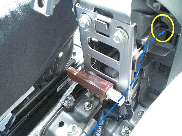 ここに、配線を通すための穴を開ける。青い線のようにコンソールのマウンティングブラケットの下を通して、一番下から取り出す。