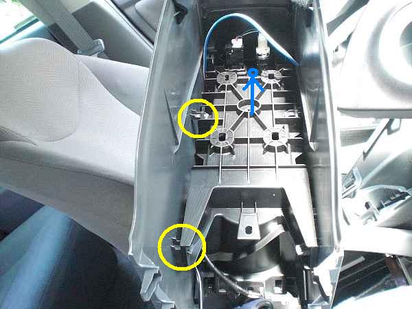 図のようにコンソールパネルアッパーを後方へこじ開け、抜くように取り外す。