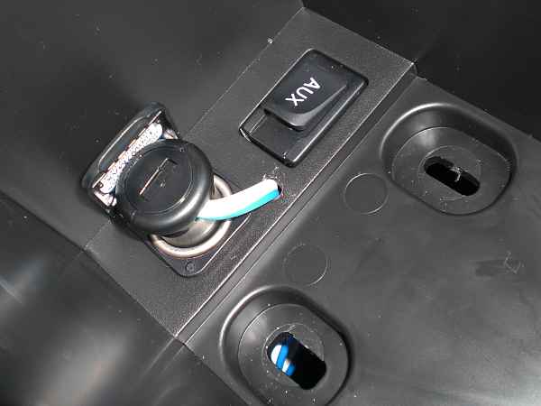 AUX端子と電源ソケットの隙間(青丸)に5mm程度の穴を開けて、ケーブルを通す。