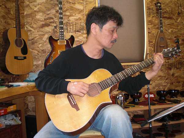 彼の手にしているギターは、そのとき名古屋から電車とバスを乗り継いでやって来た若きギター職人が、その勉強中に造ったギター6本のうちのひとつである。制作者を前にしてその作品を弾かせてもらったのは初めて。いい響きだった。将来は自分の工房を持ちたいとのことである。