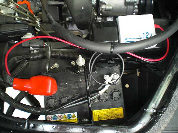 のび~太」くんである。取付は至って簡単、プラス(赤線)はプラスへマイナスはマイナスへバッテリー端子に直結するだけである。注意する必要があるのは、直結なので振動で何かに接触してショートを起こさないようにすることである。赤いLEDが点灯していればOKである。「点きっぱなしだとバッテリーが返ってあがってしまわないか?」と思うのだが12Vより低下すると作動を停止する。