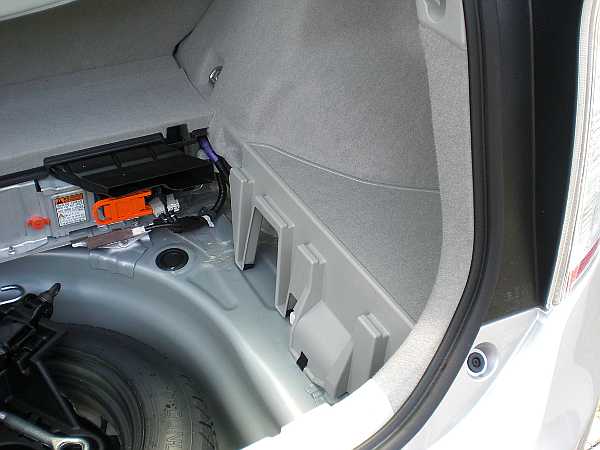 さて、次の写真は「プリウス」のトランクルームの床蓋を開け、小物トレイを外したところである。さらに、タイヤハウスの後ろのコーナーカバーを外すと右図のようにバッテリーがある。つまり