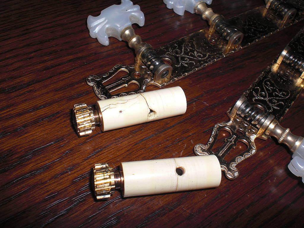 色々眺めている内に、はたと思い立った。どんなものでも良いのでひび割れているペグ(白いローラ部)と、それにねじ留めされている斜歯ギヤだけ交換すれば良いと。