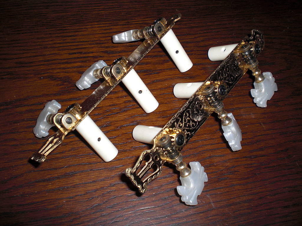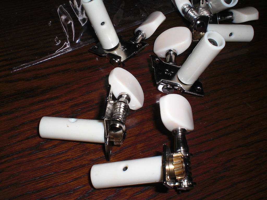 届いたペグセット。基本シルバー仕上げだがギヤ部は金仕上げで金具に丁度合う。早速ギヤを固定するビスを外して分解してみる。