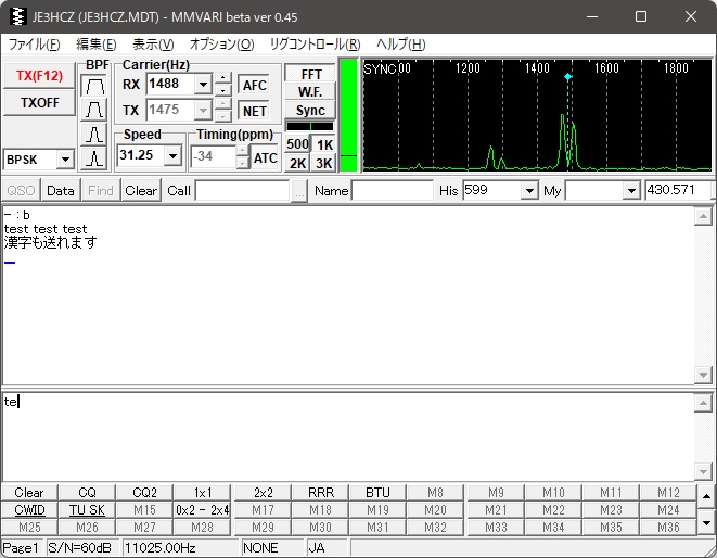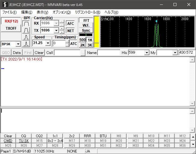 TX(F12)] をクリックすると送信を開始します。インジケータが黄色くフルスケールに触れます。