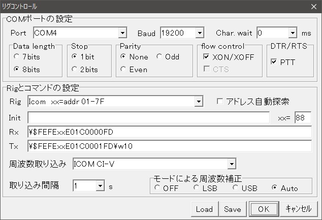 下図のように設定してみて、コントロールできないようなら逆を試してみてください。(今回COM4がCI-V)