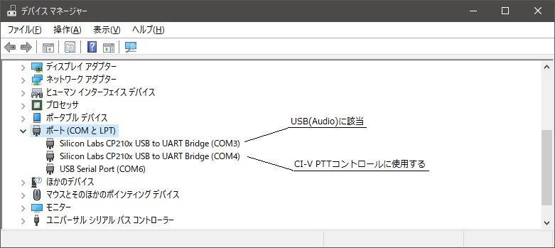 無線機に電源が入っていると、PC側にCOMポートが2つ出来ます。