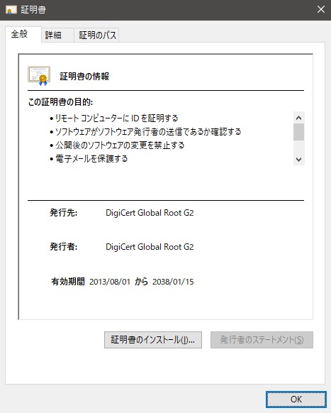 - 中間証明書が無い(ルート証明書が一つ)場合は、上記の操作をせずとも同じ画面表示にすでになっています。