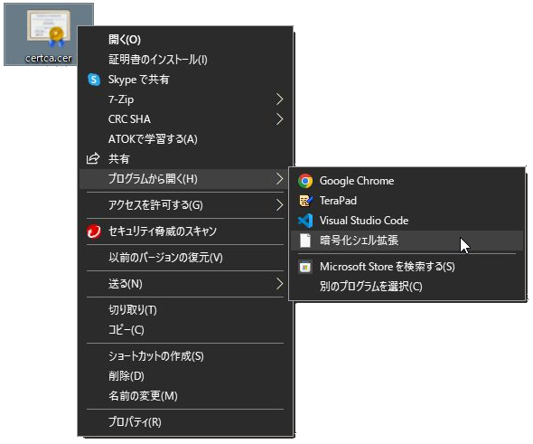 - 図のようにファイルを右クリックし、「プログラムから開く」の「暗号化シェル拡張」をクリックして証明書を開きます。