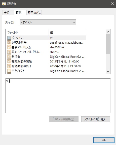 数行表示された最も上のルート証明書を選択すると[証明書の表示]ボタンが有効になるのでクリックします。