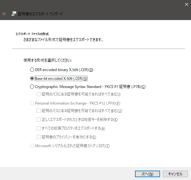証明書の上で [右ボタンクリック] から [すべてのタスク] → [エクスポート] → [次へ] と進みます。