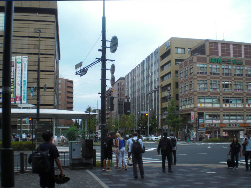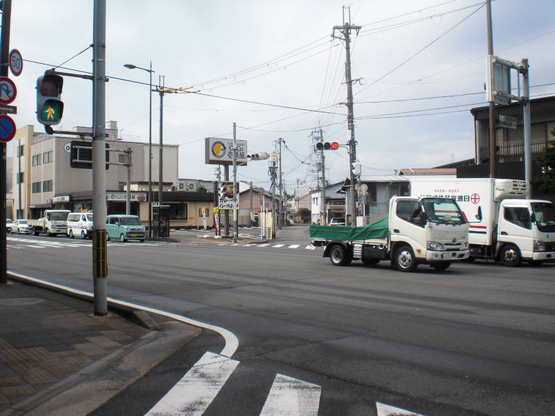 進行方向斜め左を見たところ。目の前の歩道を一つ渡り、次の大きな交差点の歩道を渡って、左方向に線路に沿って南下する道路に入る。