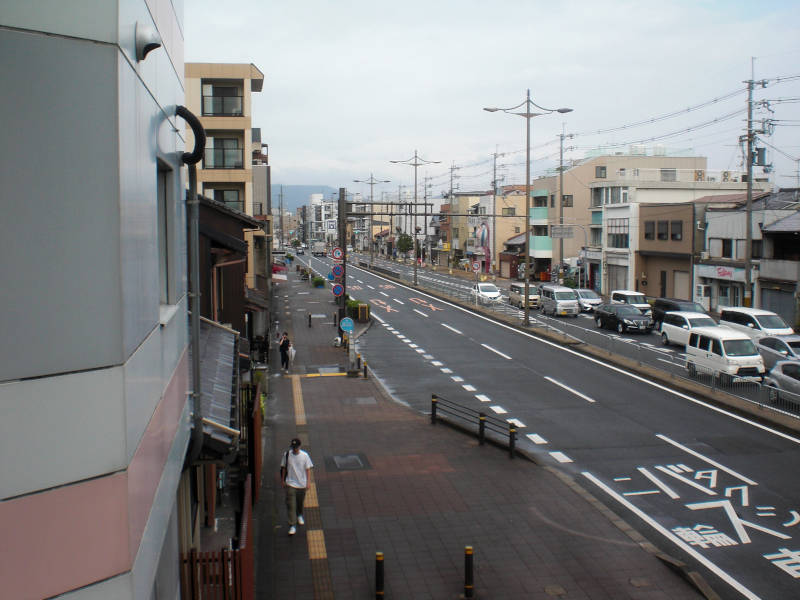 京阪国道口の歩道橋で九条通りの左側へ渡っておく。この辺りから傘は要らなくなった。