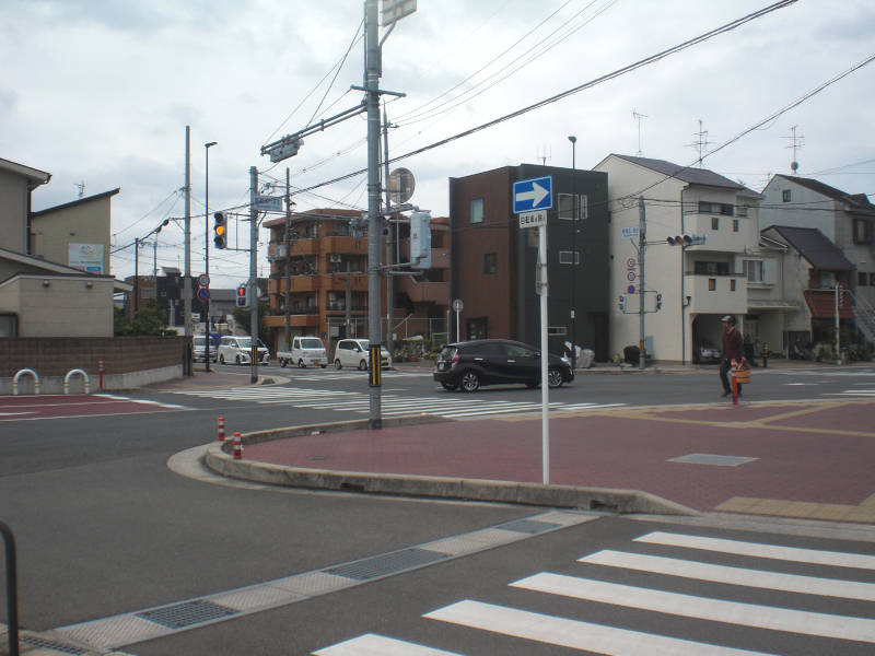 [西大路通西国街道]の交差点。この辺りでは西大路通りも南東向きとなり西国街道とは直角に交わる。