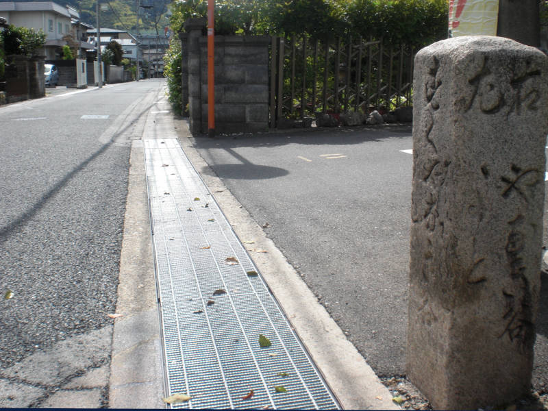 踏切を越えて2,30m先に左手に入る脇道が有る。これが西国街道で有る。大きな道標が有り