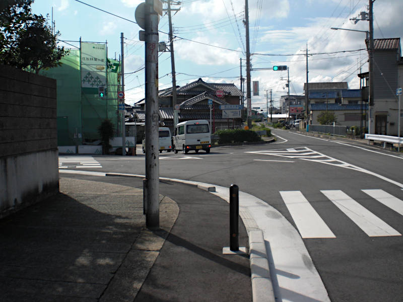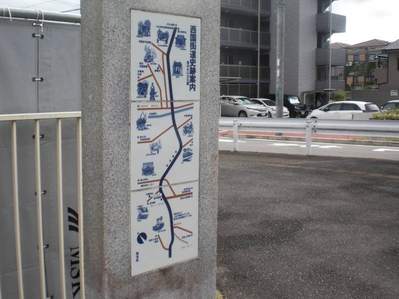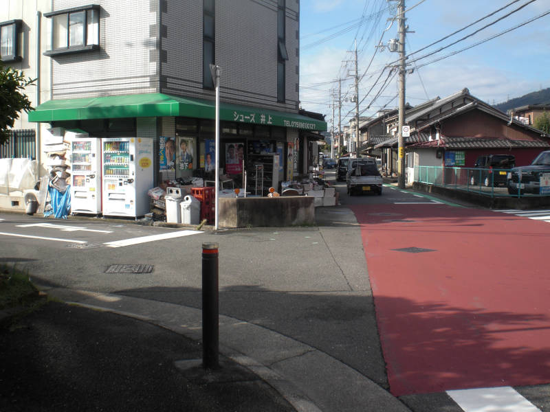ちょっと迷う交差点ではあるが、この赤茶色の舗装は西国街道を表示しているのだと思う。東海道でもこれと同じ色の舗装に各地で出会った。(8:27)