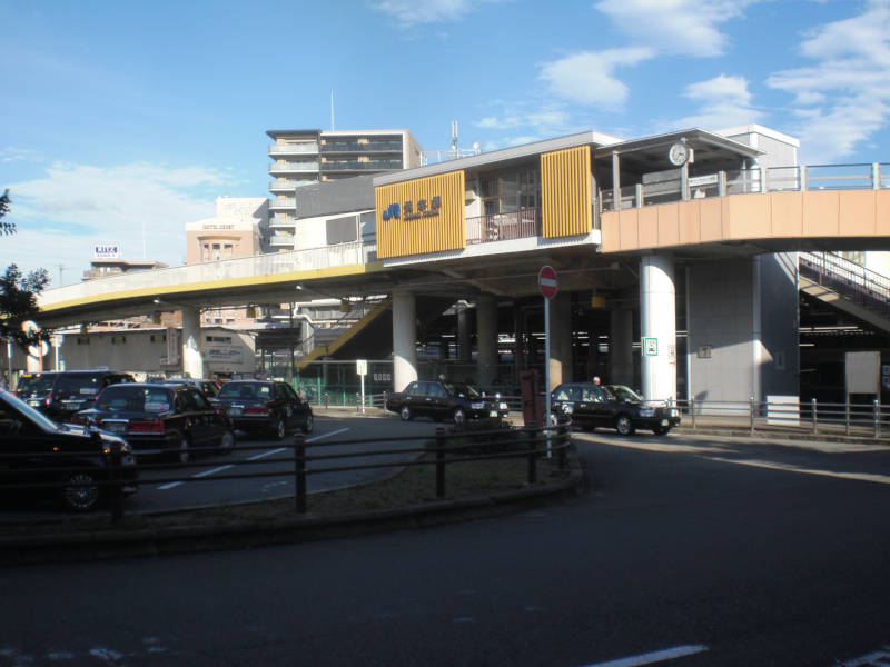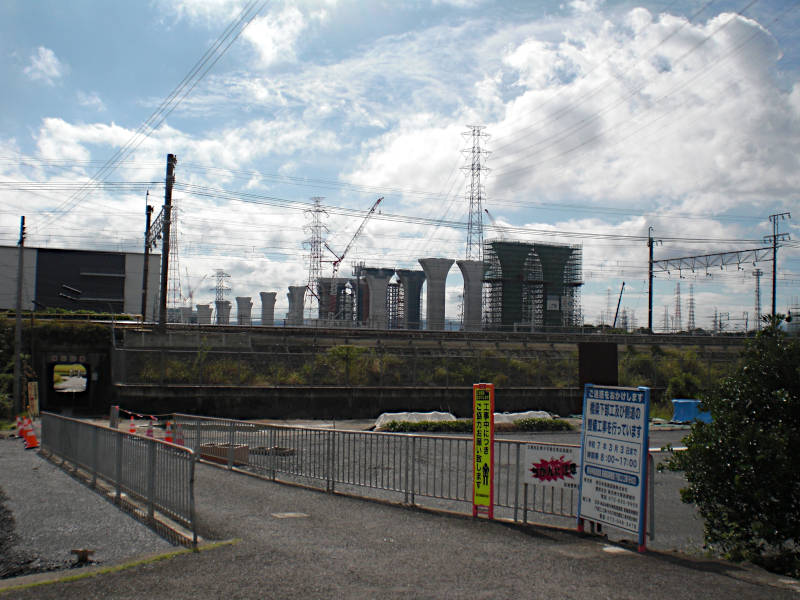 左手にJRを見ながら線路伝いに暫く行くと、高層ビルのような橋脚が整然と並んで工事されている現場が見えてきた。