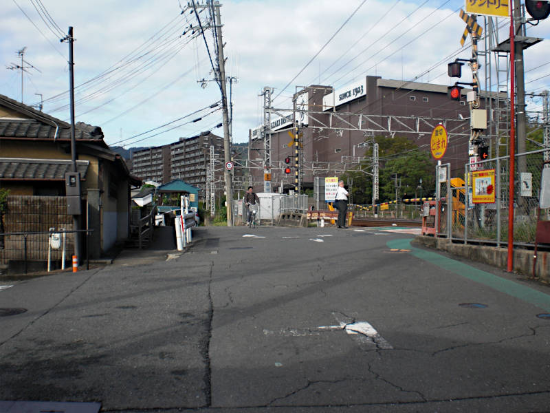 更に八幡宮を回り込んで左に曲がると、暫くしてここぞ山崎という建物が目を引く。踏切をかすめて直進する。(8:22)