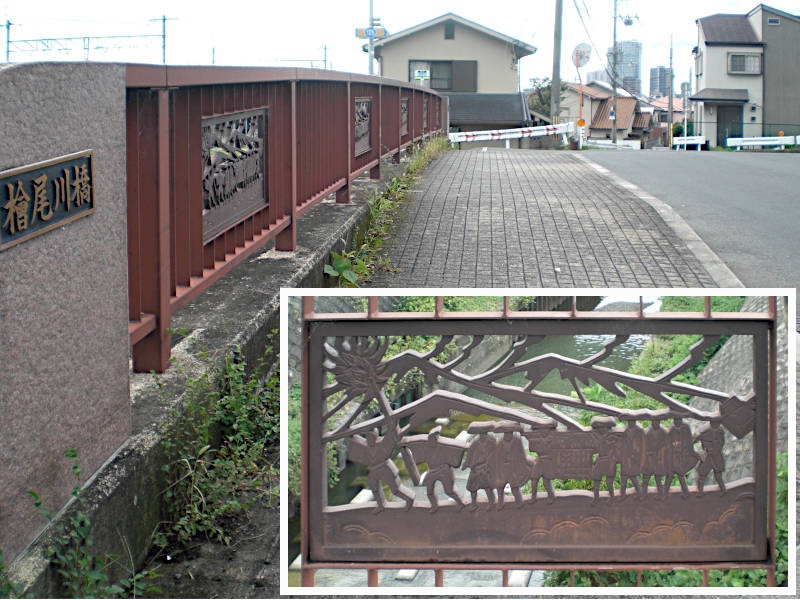 檜尾川橋を渡る。欄干に施された参勤交代のモチーフが往時を偲ばせる。(10:05)