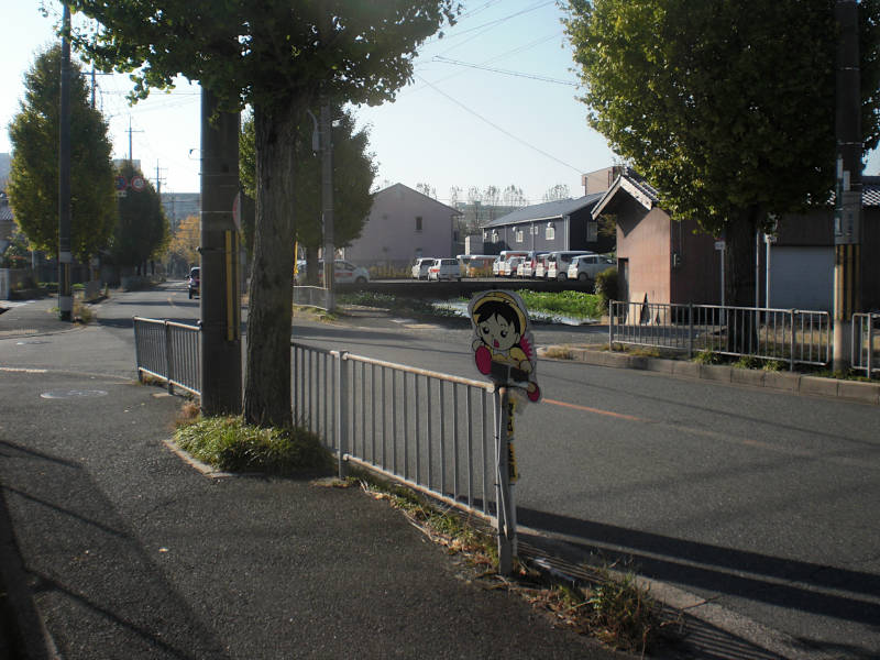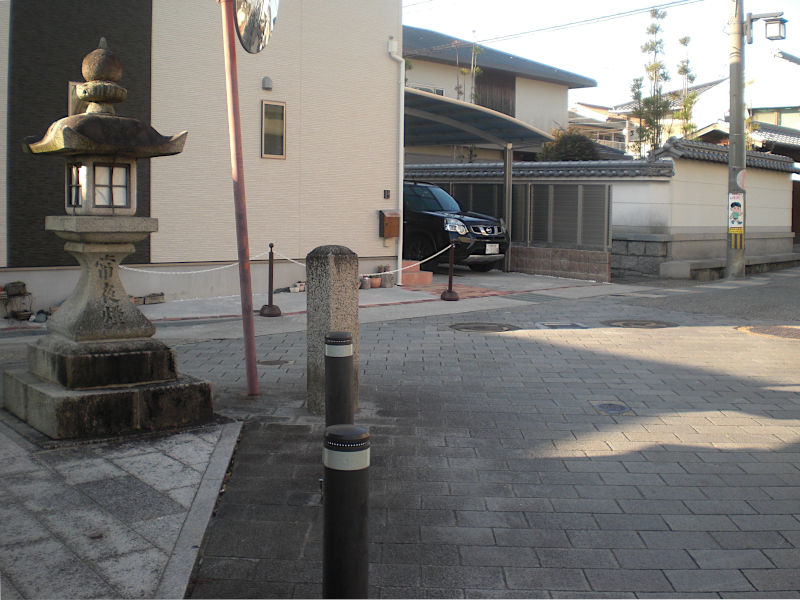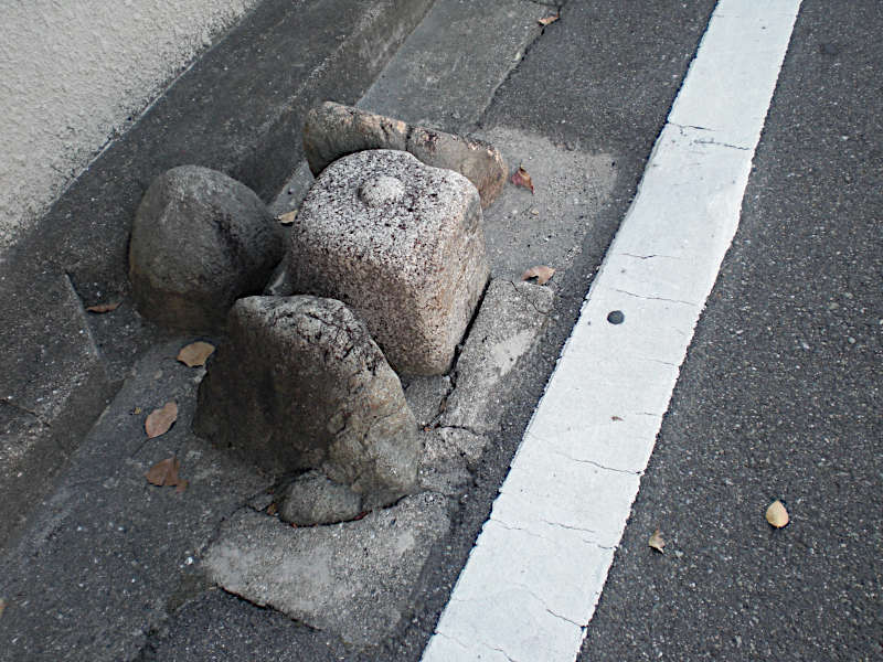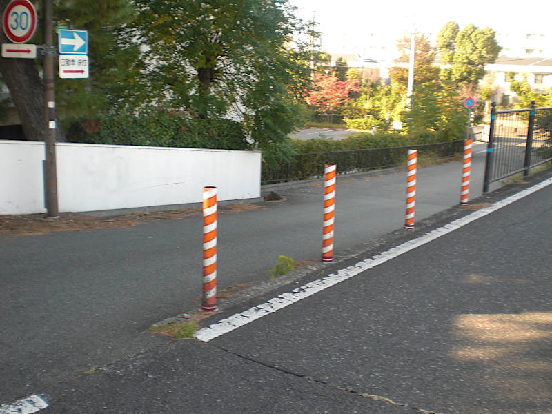 「報徳学園高校」の前を過ぎ少し下っていくと、グリーンの歩道が途切れるところが有る。電柱の陰に<