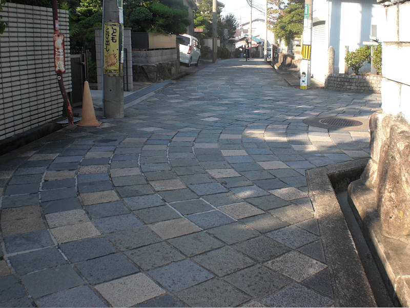 ずっと綺麗な石畳の道が続いているが、ここは少し変わって三叉路の横道から放射状に石が敷かれている。