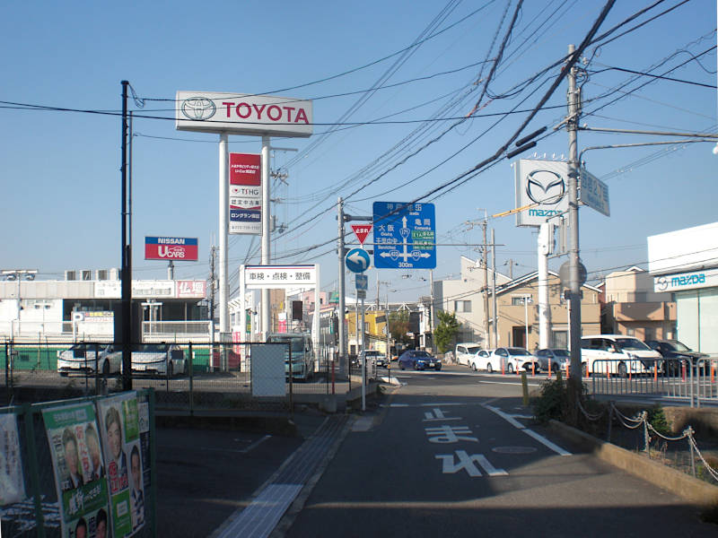 歩道橋の上から171号線と西国街道を望む。(9:35)