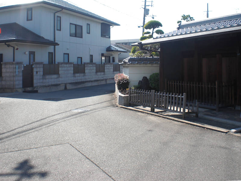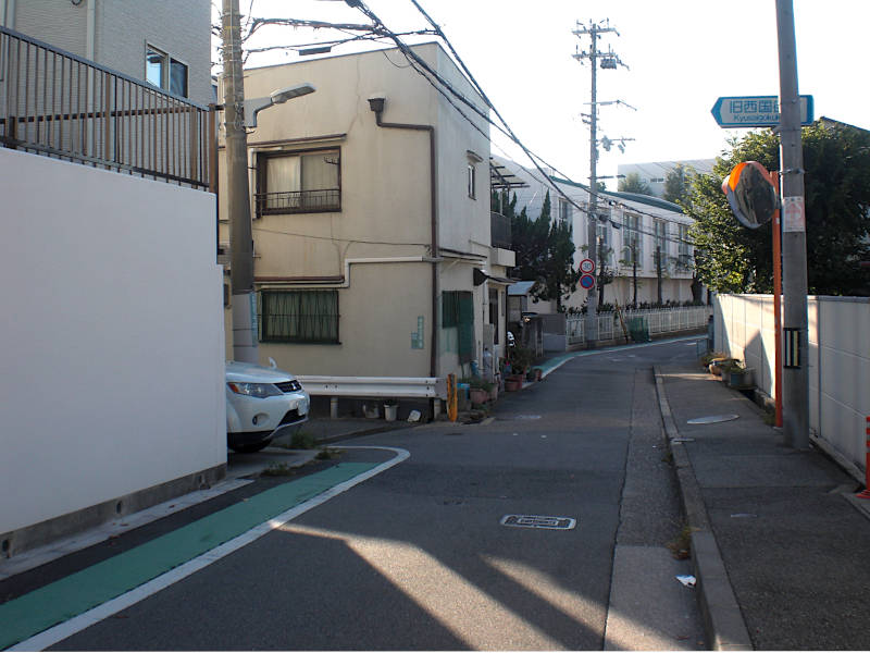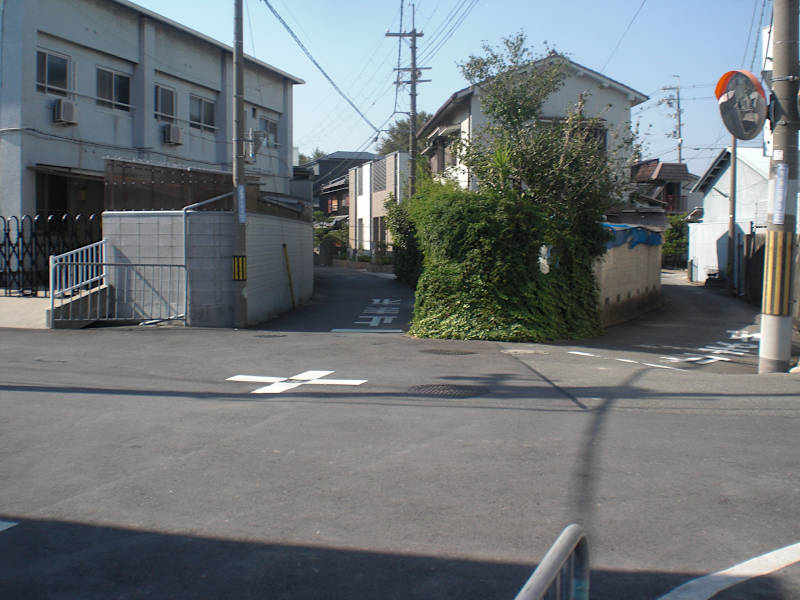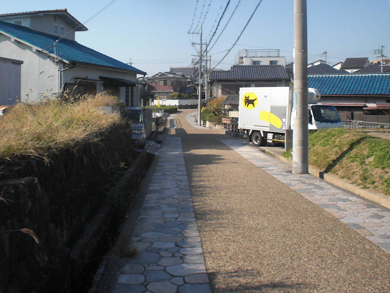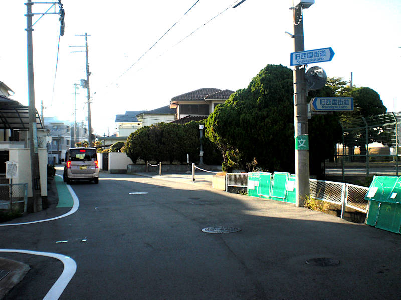 突き当たりを斜め右に取り、後は道なりに進んでいくと車道に出るが、西国街道はそのまま真っ直ぐ車道を斜めに横切る。