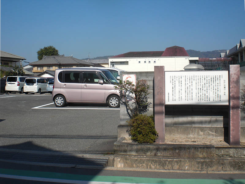 駐車場の脇、赤い歩道の電柱横に2つの道標が立っている。別の場所にあったものをここに移したとある。