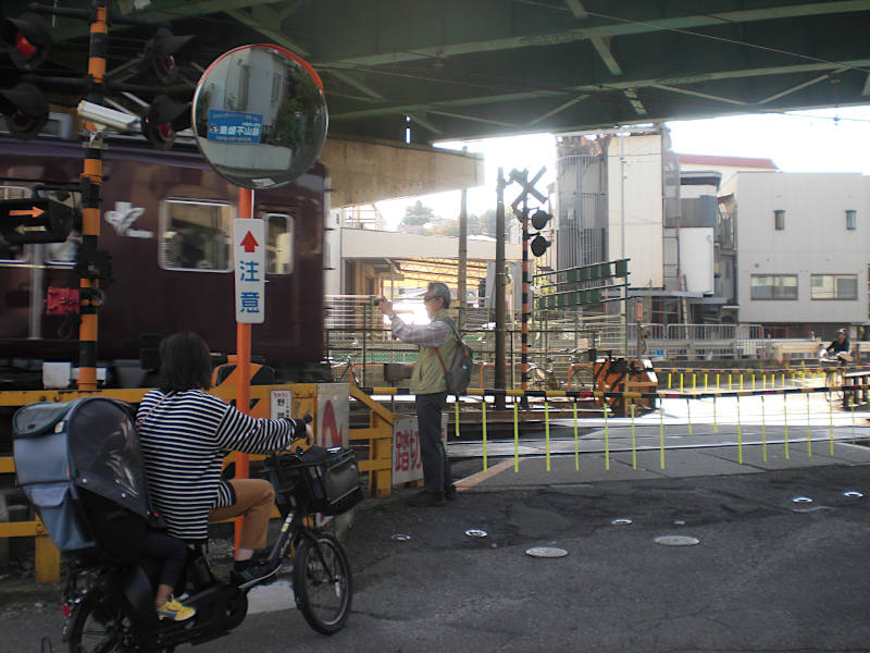 阪急宝塚本線の踏切である。線路脇のちょっとした広場には「