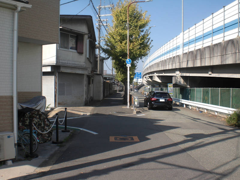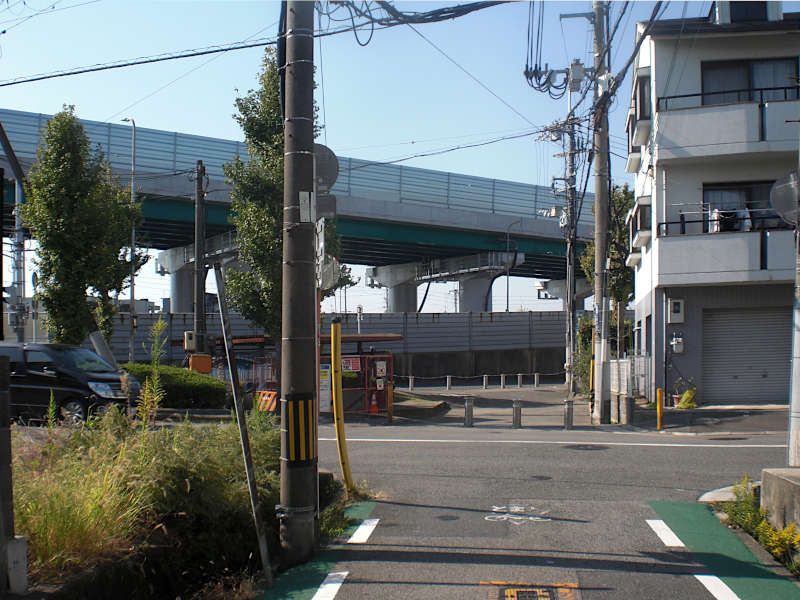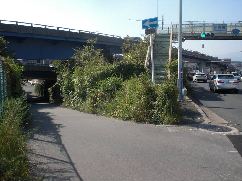 渡りきった所に左へ下って、「大阪中央環状線」の向こう(左側)へ抜けられる。