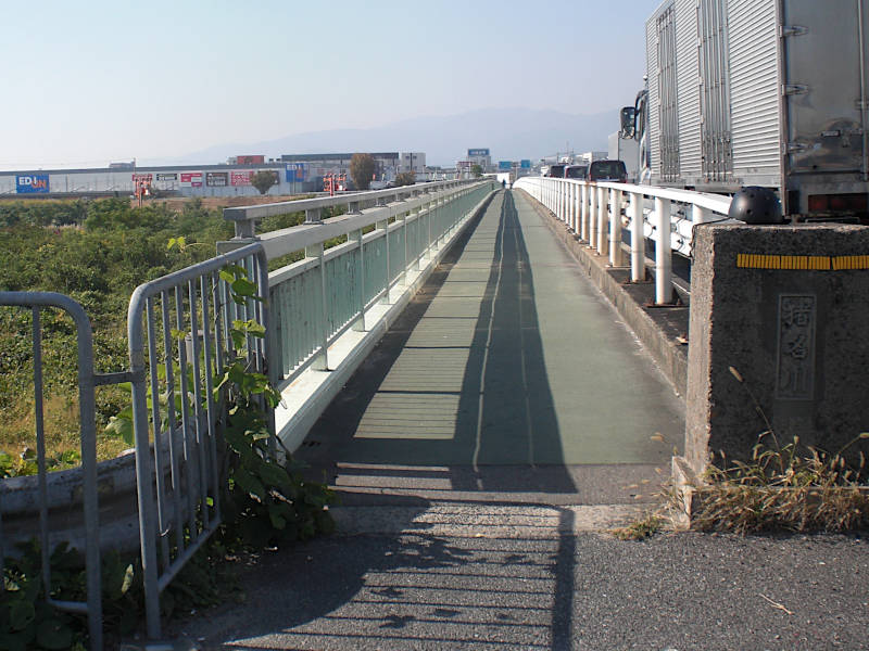 渡りきった所を左折して、車道を避け堤防の上を行く。返って旧街道らしい雰囲気(実際はここは旧街道ではないが)。(11:40)