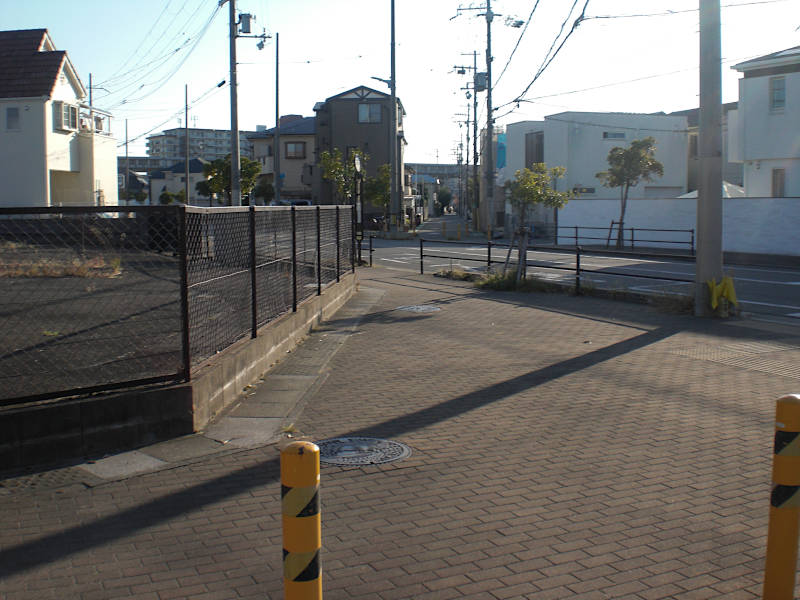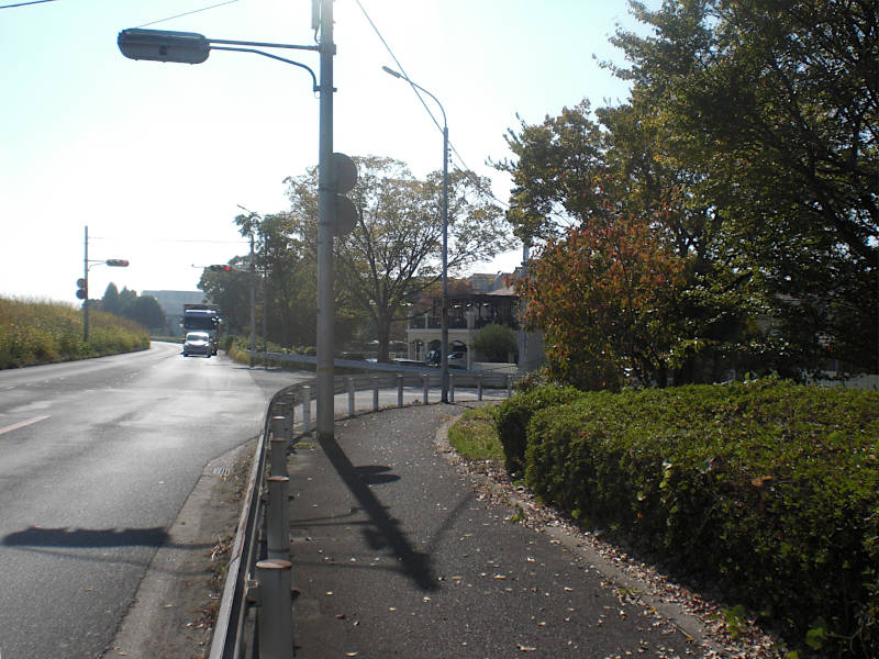 元々街道だったからか、歩道隣の土地が街道方向にカットされている。(15:15)