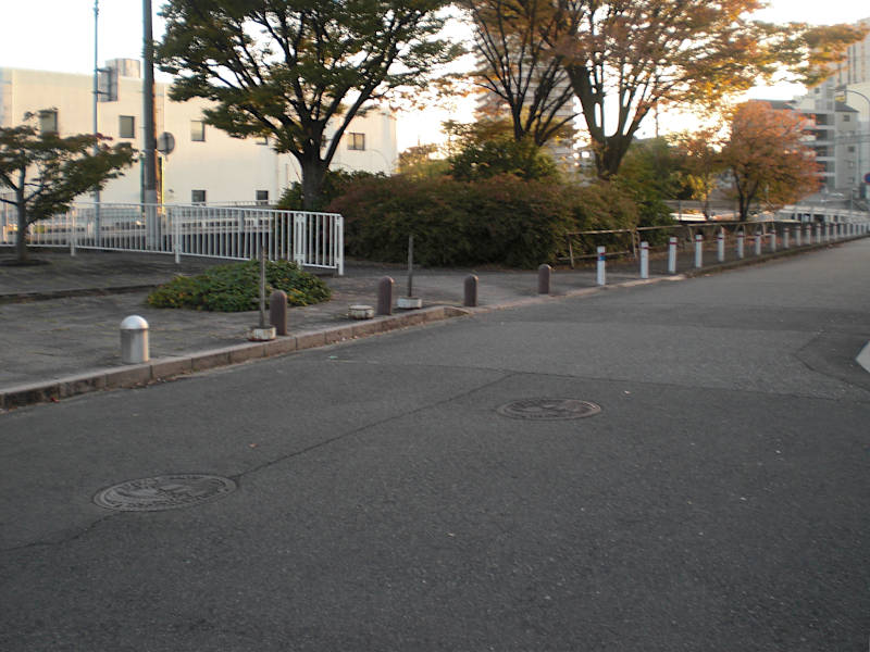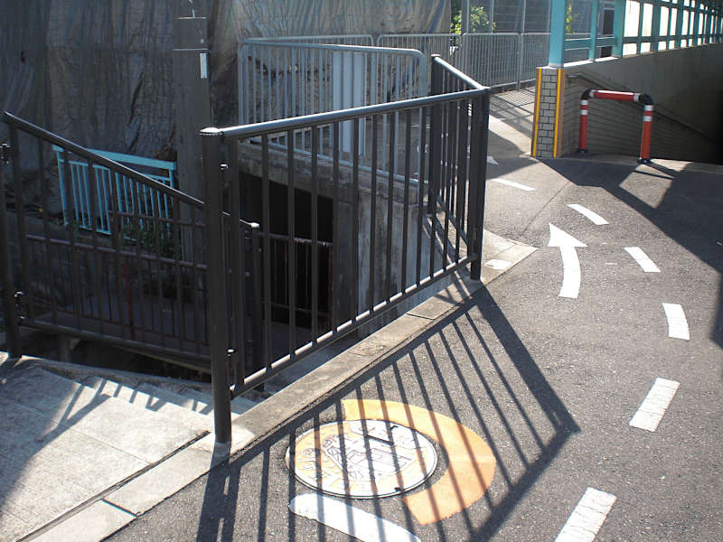 左側から近づいてきた車道が171号線と合流する三角エリアに地下横断歩道の入口が有る。反対側に出るとすぐ目の前に歩道の保護柵の切れ目が見える。