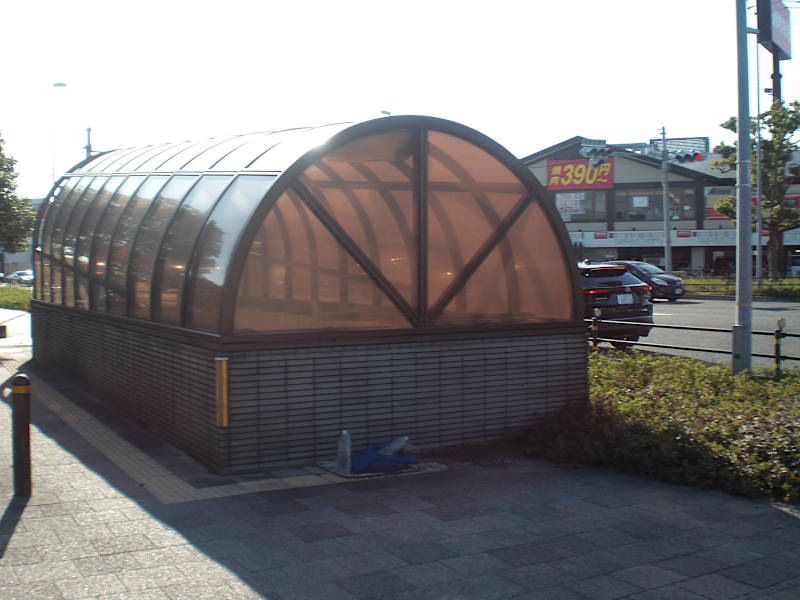 やっと左へカーブし出したなと思われるところにアクリドームのような地下横断歩道の入口が有る。(14:16)